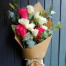 Букет поможет проявить заботу и теплоту по отношению к адресату. Неповторимое сочетание роз с эвкалиптом и лизиантусом актуально на любое торжество для выражения собственных чувств к родным и близким.